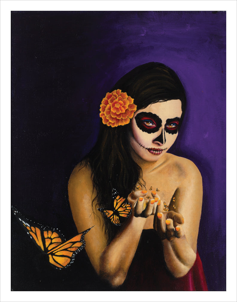 - Inspired by the traditional, cultural Dia de los Muertos, Orange sugar portrays a woman with sugar skull makeup with a marigold flower in her hair releasing monarch butterflies. I wanted to create a physical depiction of this sacred day. A day that honors and celebrates those who passed before us. With the marigold flower in her hair, she usher back the souls of the dead (the monarchs) back to land of the living to be connected with their loved ones again.