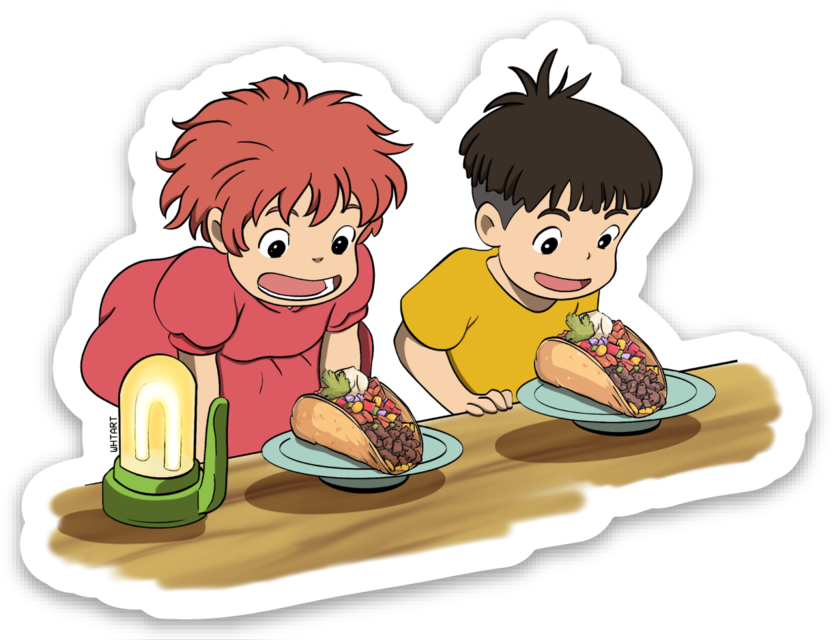 - Who doesn't love anime and tacos? This is one of many stickers from the Anime & Tacos line featuring iconic anime characters eating tacos.