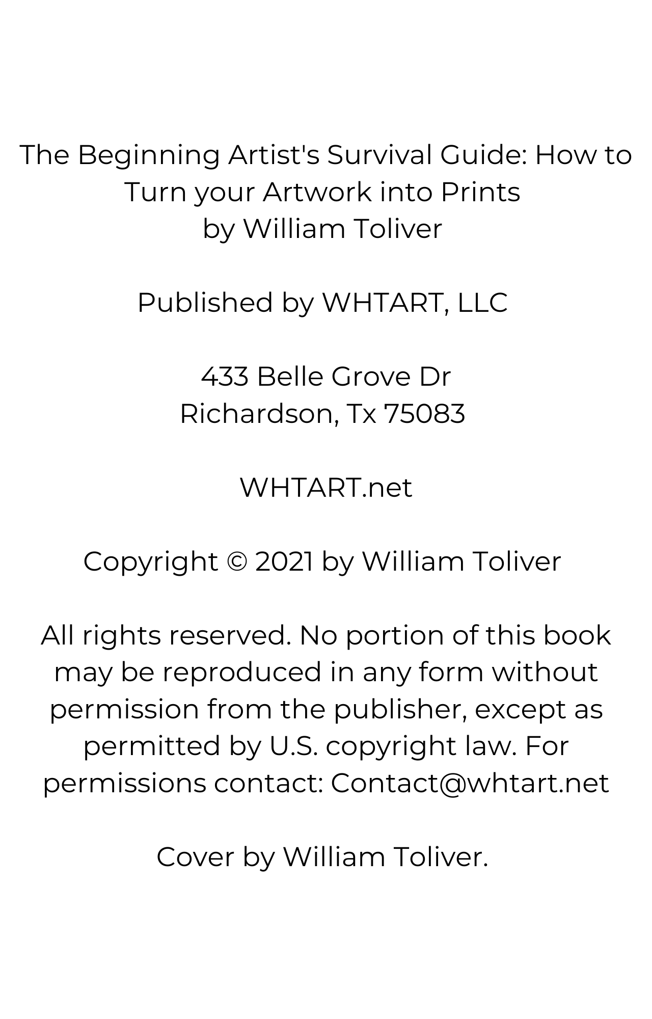 This book is meant for the beginning artist who wants to sell prints of their artwork, but doesn't know where to start. This comprehensive guide shows you how to turn your artwork into sellable prints in 3 easy steps. This guide also provides detailed information about resolution, color correcting, and paper suggestions for reproducing digital copies of your artwork.