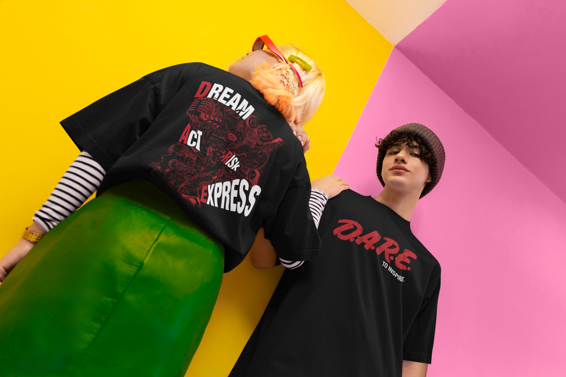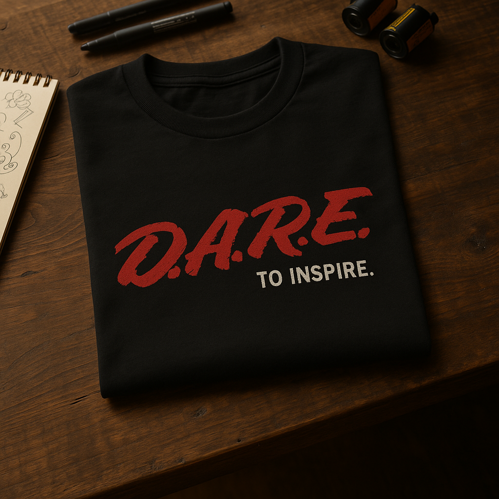 This tee’s for the ones who grew up on D.A.R.E. assemblies and sketchbooks in their backpacks, but flipped for the ones leading the new wave. Dream. Act. Risk. Express. It’s a mindset. A reminder to move with purpose, create with guts, and speak your truth loud. Nostalgia with new energy.